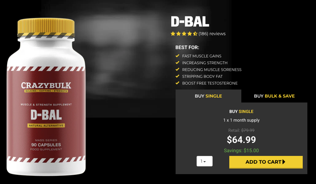 D-Bal is sold on the official CrazyBulk site at a cost of $64.99 per bottle (90 capsules), representing a month’s supply.